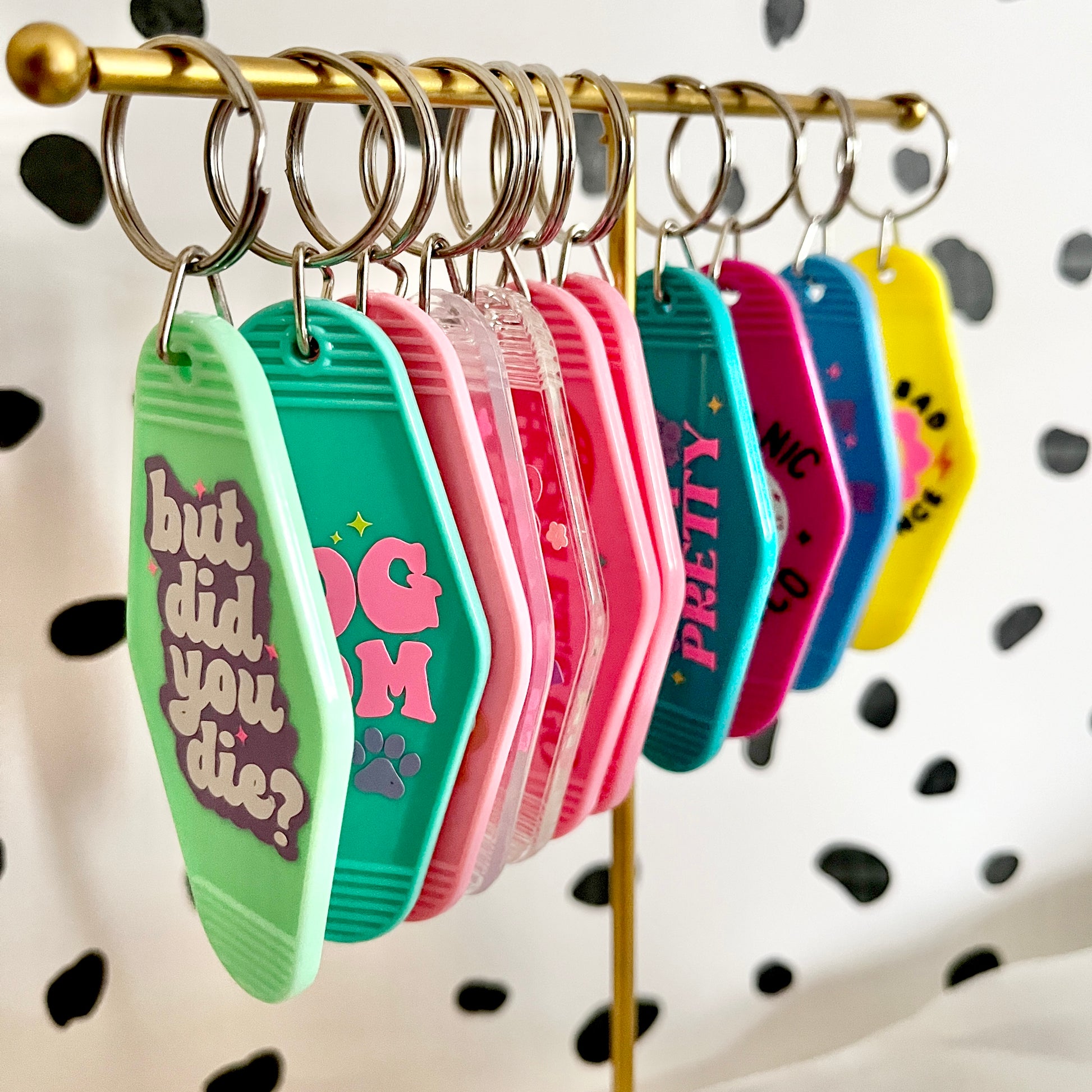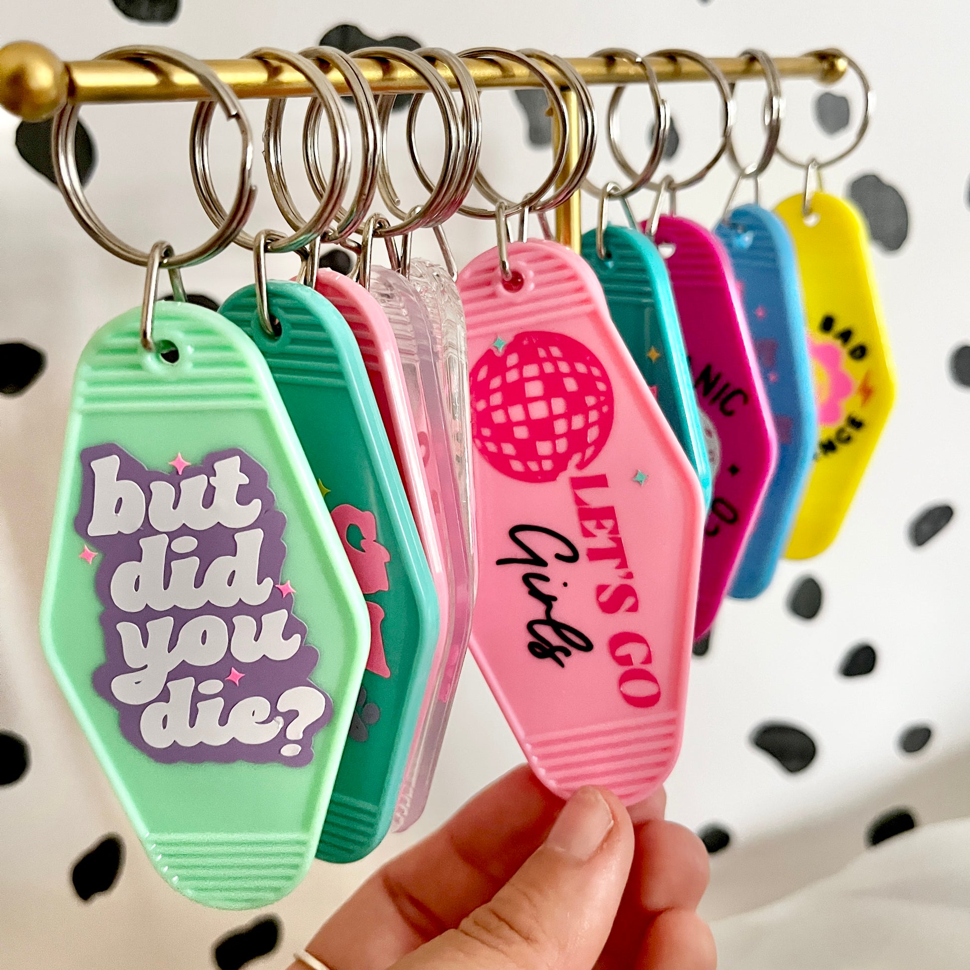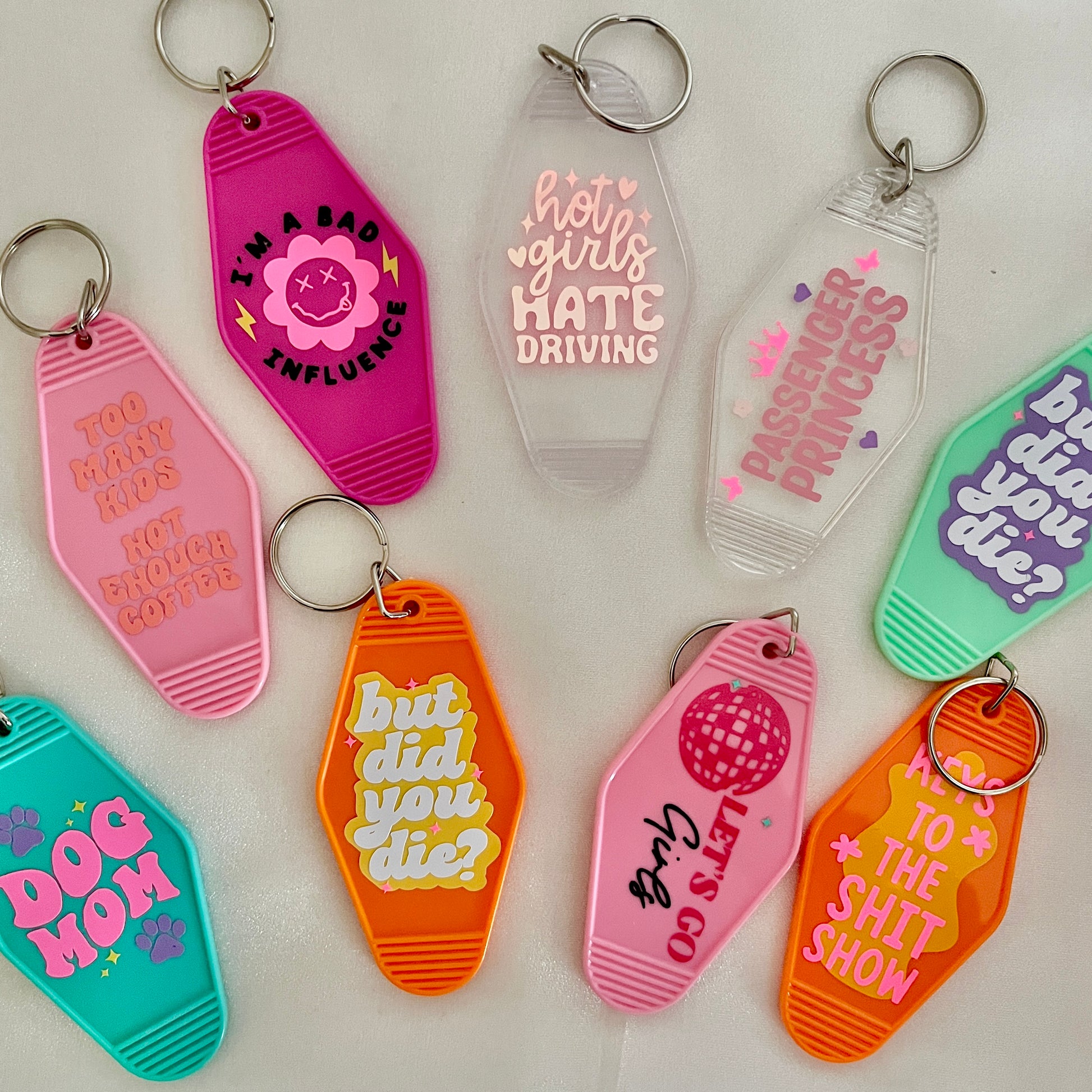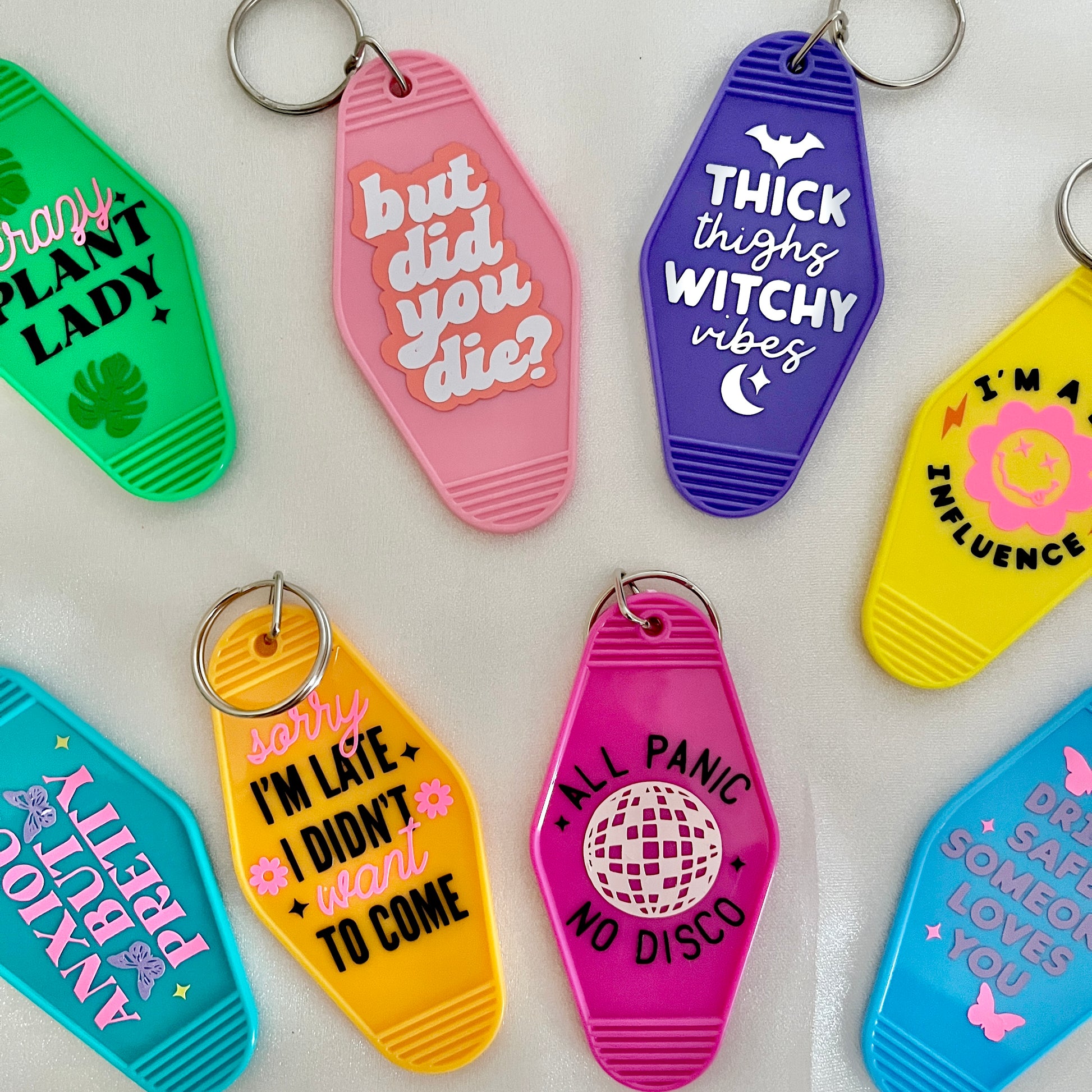 Introducing our Motel Keychains! These funky and fun keychains come in a variety of colors and feature quirky quotes to add some personality to your keys. With multiple options to choose from, they make the perfect accessory or gift. Elevate your key game with our Motel Keychains today!