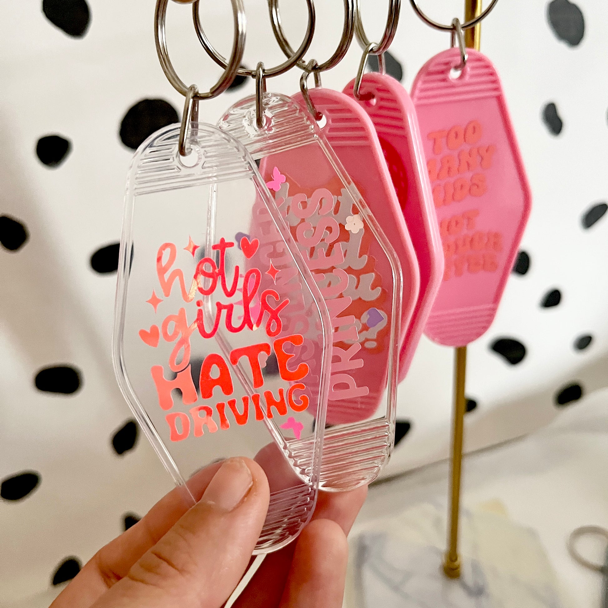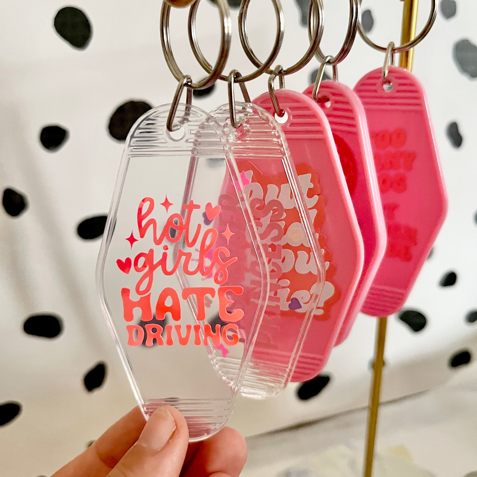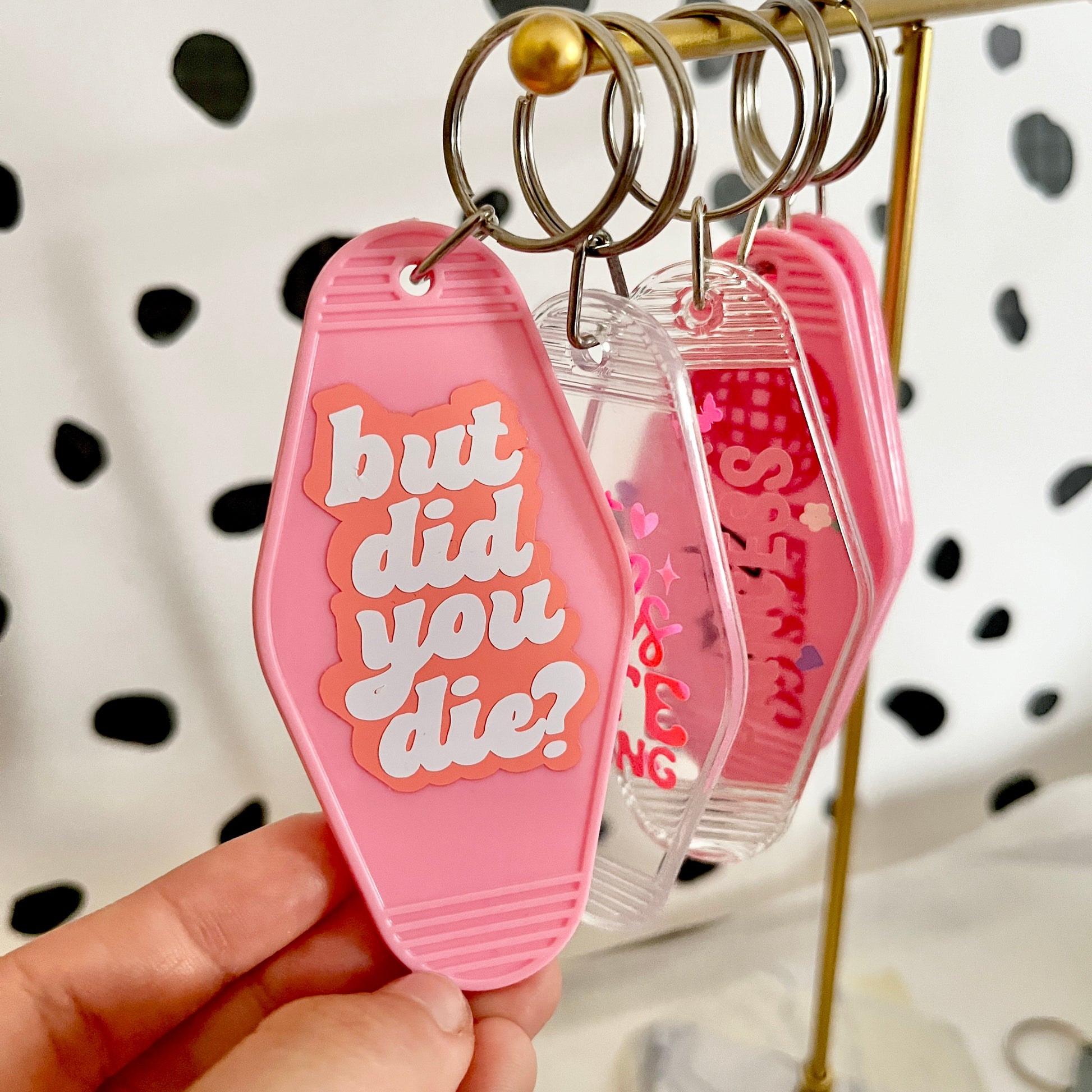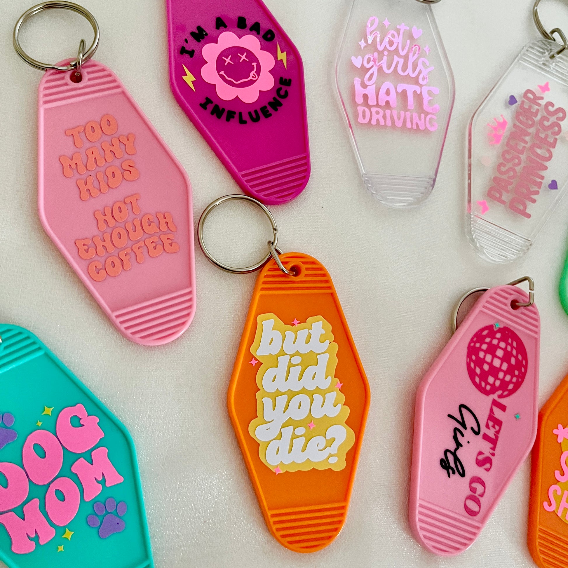 Introducing our Motel Keychains! These funky and fun keychains come in a variety of colors and feature quirky quotes to add some personality to your keys. With multiple options to choose from, they make the perfect accessory or gift. Elevate your key game with our Motel Keychains today!