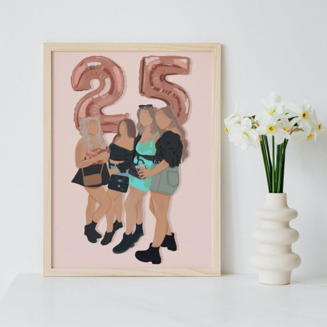 Celebrate a special birthday with a personalised illustrated print! This gorgeous print is made to order, making it the perfect gift for friends and family. Add birthday balloons to make it stand out even more. Brighten someone's day with this unique and thoughtful present. A perfectly unique birthday gift made to order!